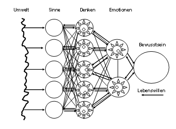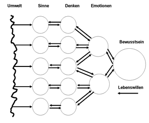 Während der Lebenswillen in Richtung Umgebung nach außen gerichtet ist, sind die Umgebungseinfüsse nach innen in Richtung Bewusstsein gerichtet.